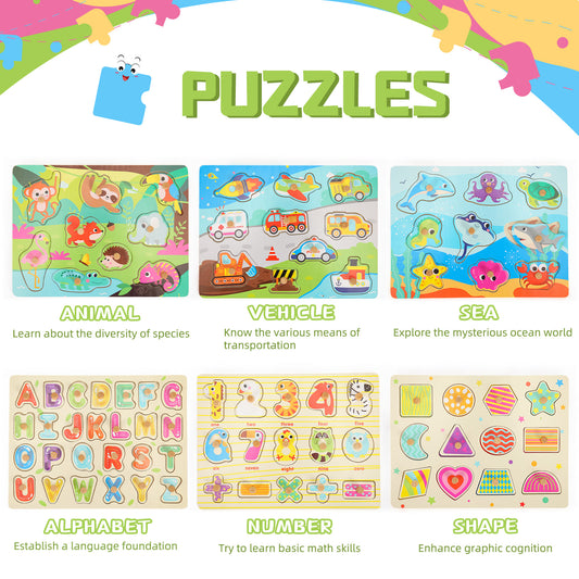 Rundad Toddler Puzzles and Rack Set, Wooden Peg Puzzle Bundle with Storage Holder & Teaching Clock, Educational Knob Puzzles for Kids Ages 2 3 4 5 Years - Alphabet Number Shape Animal Vehicle Sea
