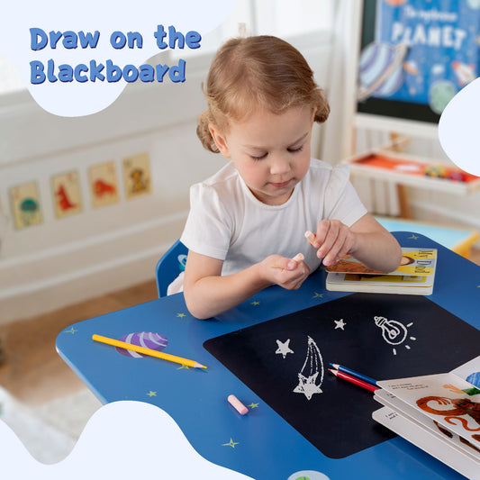 Rundad Kids Table and Chair Set with Chalkboard, Space Alien Theme Desk and Chairs for Toddler Boys 2-4 Year Old, Wooden Children Furniture Suit for Home & Classroom Drawing Reading